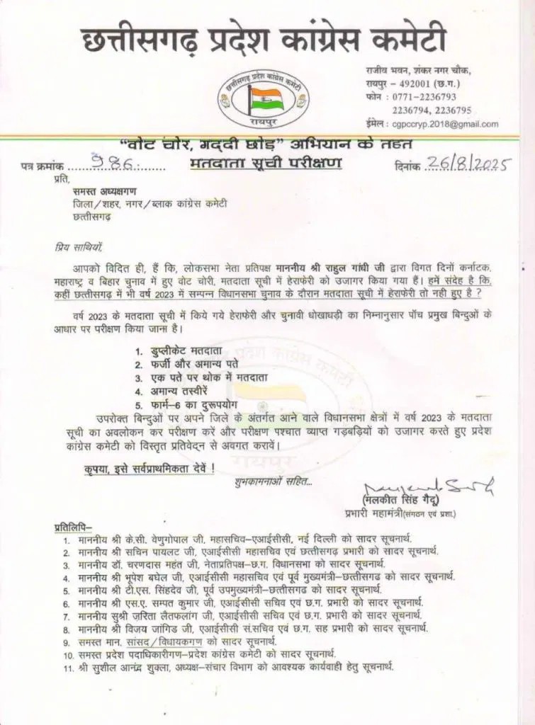 छत्तीसगढ़ में फर्जी वोटरों की पहचान करेगी कांग्रेस, PCC ने जिलाध्यक्षों को दिया आदेश
