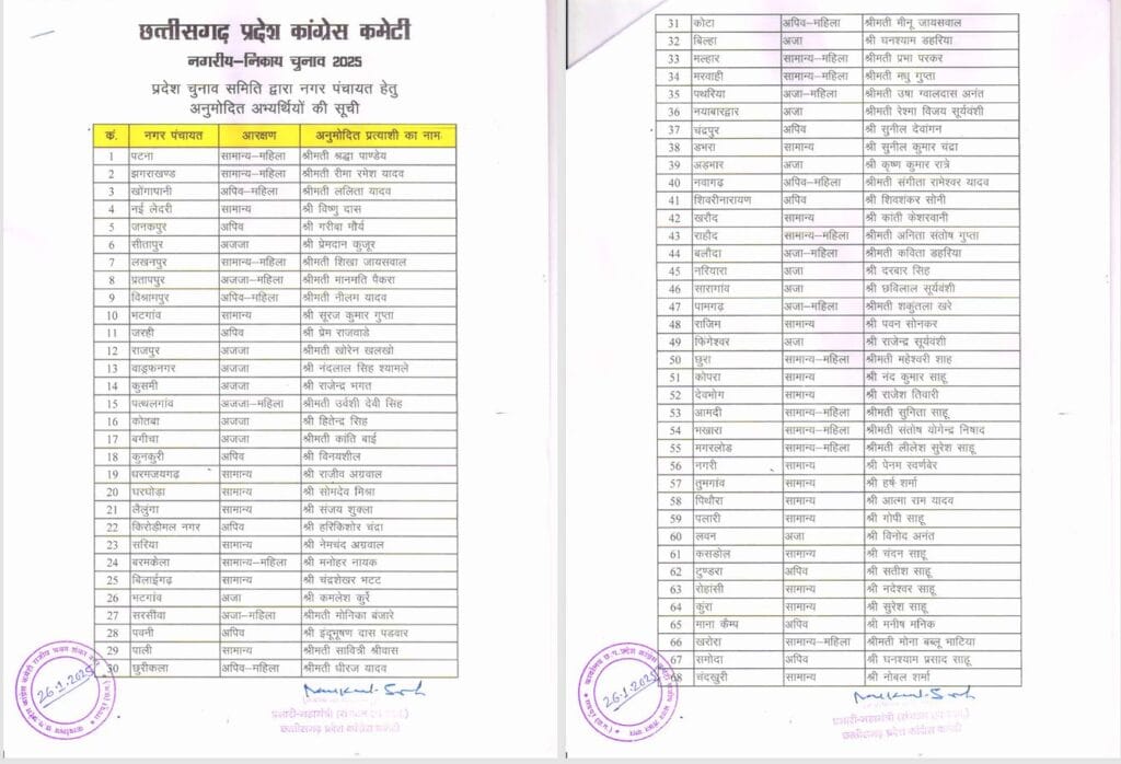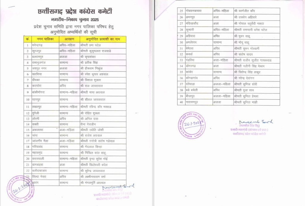 कांग्रेस ने छत्तीसगढ़ में 40 नगर पालिका परिषदों के अध्यक्ष पदों के लिए भी प्रत्याशियों का ऐलान किया है। इसके अलावा, 102 नगर पंचायतों के लिए भी उम्मीदवारों की लिस्ट जारी की गई है।
