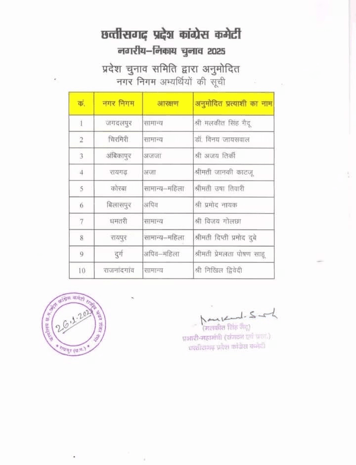 कांग्रेस पार्टी ने निम्नलिखित नगर निगमों के लिए मेयर प्रत्याशियों की घोषणा की है: