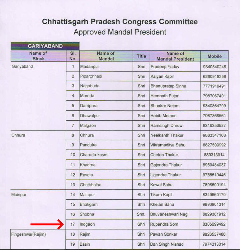 कांग्रेस द्वारा हाल ही में जारी की गई नवनियुक्त मंडल अध्यक्षों की सूची में गरियाबंद जिले के मैनपुर ब्लॉक के इंदागांव मंडल अध्यक्ष के रूप में रूपेंद्र सोम का नाम शामिल किया गया। लेकिन हैरानी की बात यह है कि रूपेंद्र सोम का पहले ही निधन हो चुका है। सूची सामने आते ही यह मामला राजनीतिक हलकों में चर्चा का विषय बन गया।