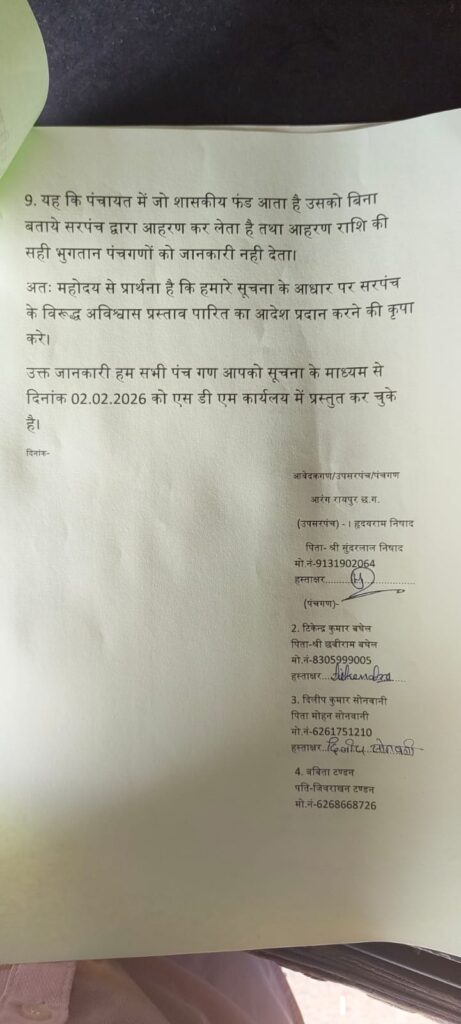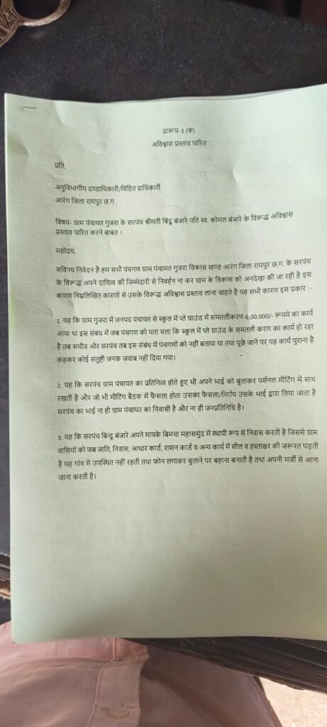 आरंग | रायपुर: रायपुर जिले के आरंग विकासखंड अंतर्गत ग्राम पंचायत गुजरा में पंचायत राजनीति गरमा गई है। सरपंच बिंदू बंजारे के खिलाफ उपसरपंच सहित कई पंचों ने मोर्चा खोलते हुए गंभीर आरोप लगाए हैं। पंचों ने अनुविभागीय अधिकारी (SDM) अभिलाषा पैकरा को ज्ञापन सौंपकर सरपंच के विरुद्ध अविश्वास प्रस्ताव लाने की औपचारिक मांग की है।